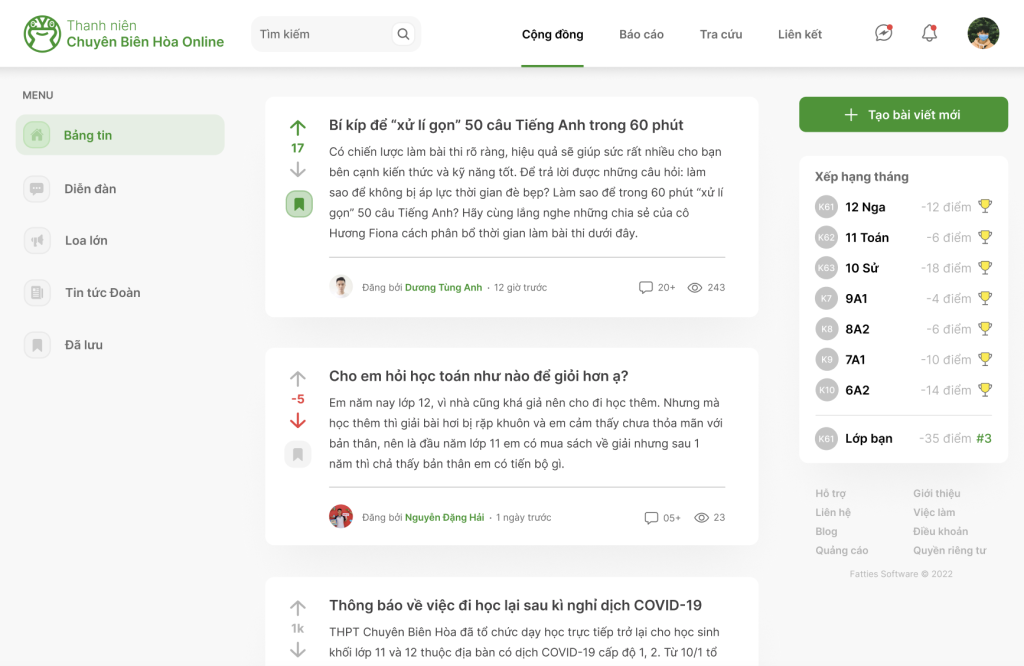 Bảng Tin (News Feed) và Diễn Đàn (Forum): Là nơi để học sinh cập nhật thông tin, chia sẻ các bài viết, hoạt động của trường, thảo luận về các chủ đề học tập, câu lạc bộ, hay đời sống học đường. Diễn đàn được tổ chức theo các chuyên mục rõ ràng, giúp dễ dàng tìm kiếm thông tin chuyên ngành hoặc sở thích.